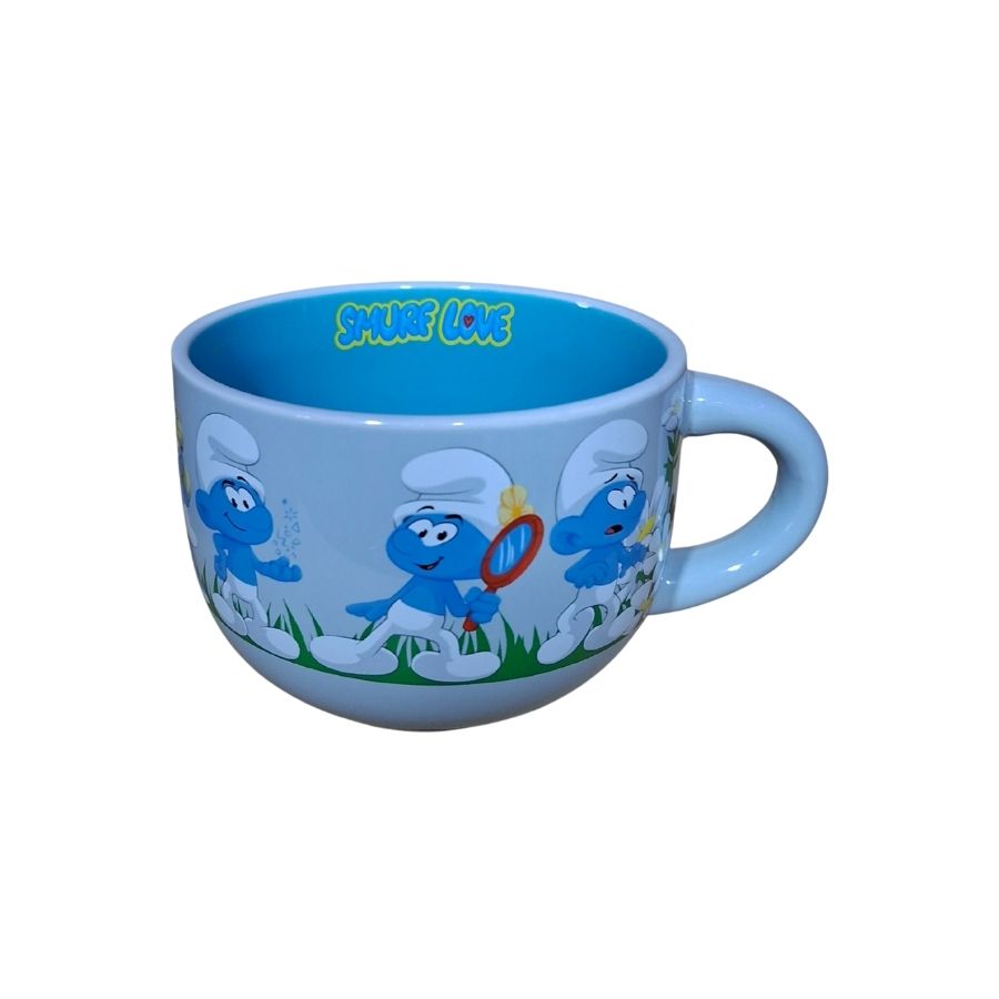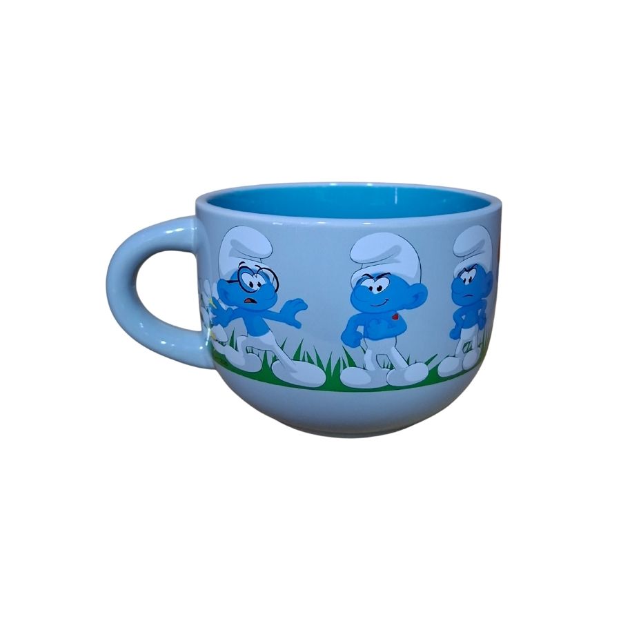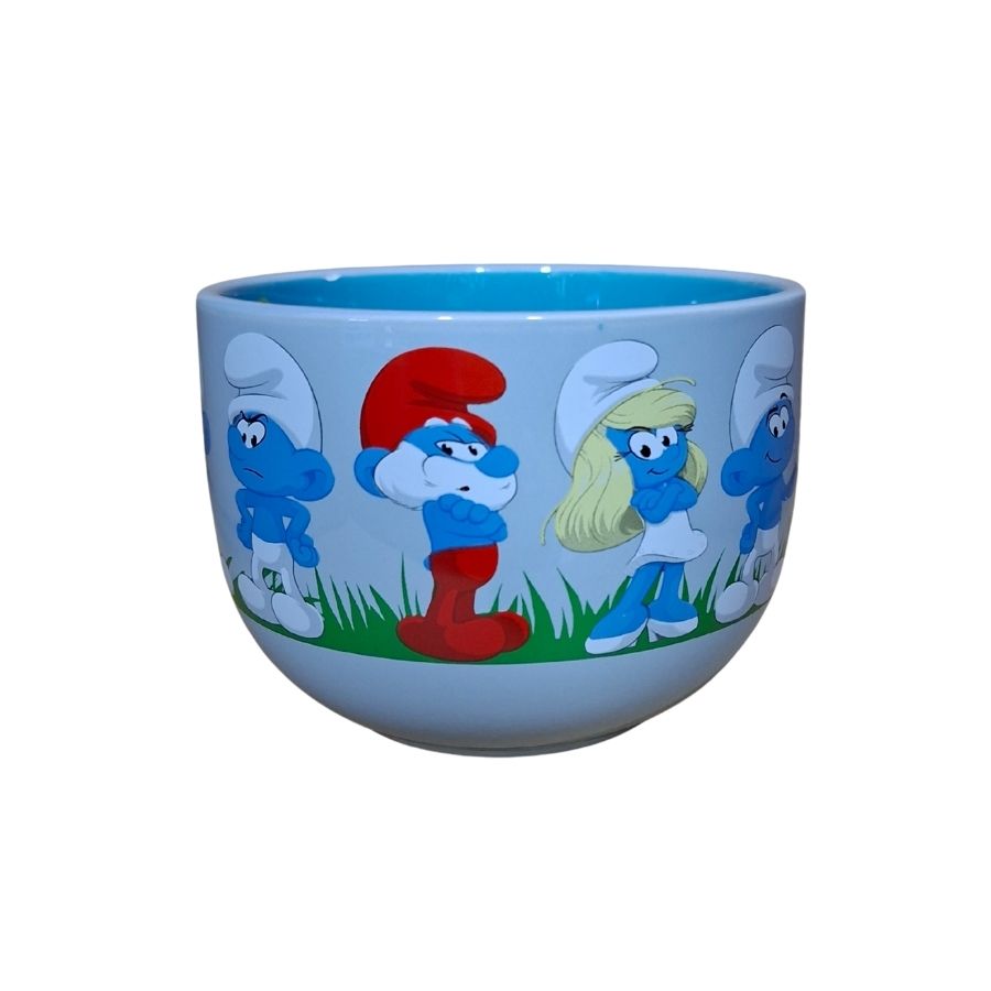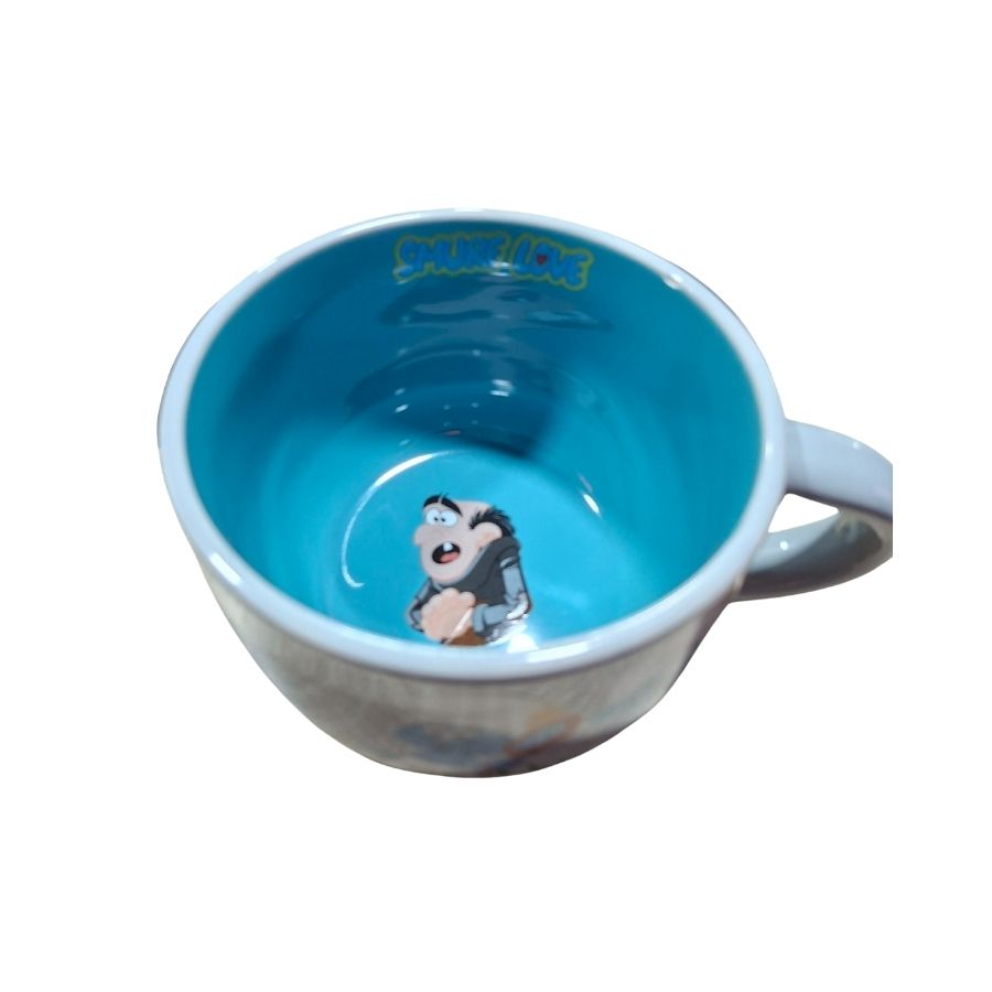 Este increíble tazón muestra en su exterior a los divertidos Pitufos sobre un fondo gris claro, mientras que en el interior sorprende con la imagen del inolvidable Gargamel, creando un contraste único y coleccionable.